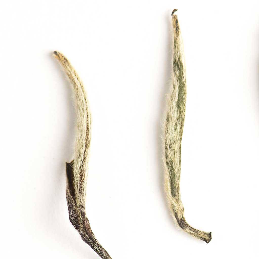 Las hojas jóvenes recolectadas están recubiertas de unos pelillos llamados tricomas. Estos tricomas tienen la función de protección y también de mantener la humedad en la yema. Una vez elaborado esté té silver needl, estos tricomas son los que le dan la apariencia blanca a la hoja. Entonces la yema aún no desarrollada con forma de aguja recubierta por esta pelusilla blanca, le da una apariencia de aguja de plata. De aquí viene que a este té también le llamen agujas de plata.