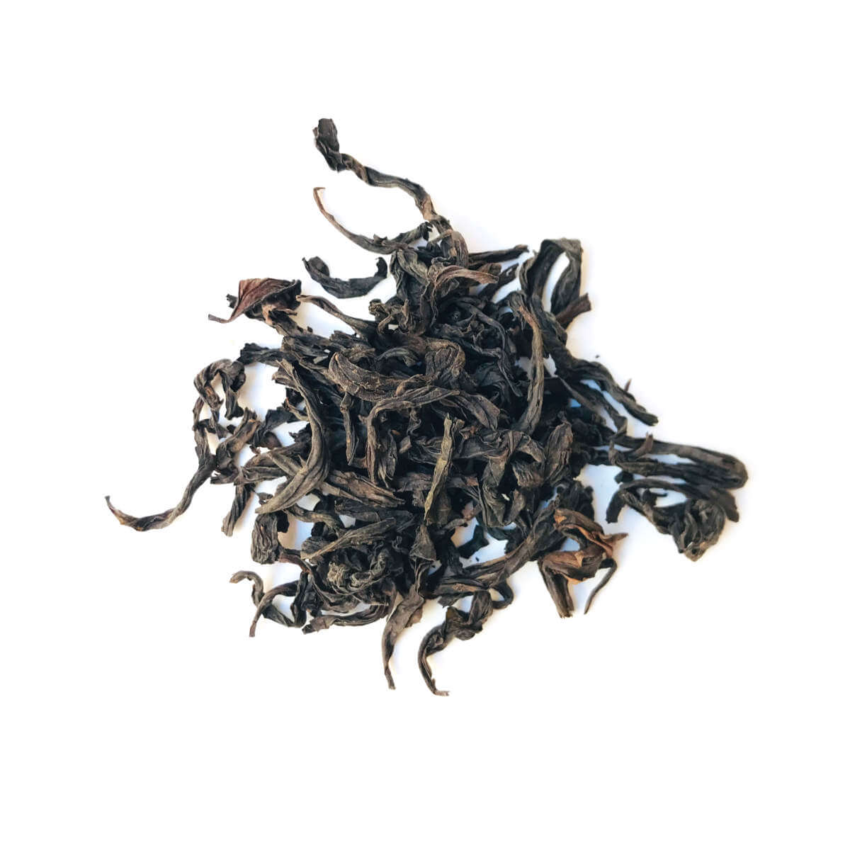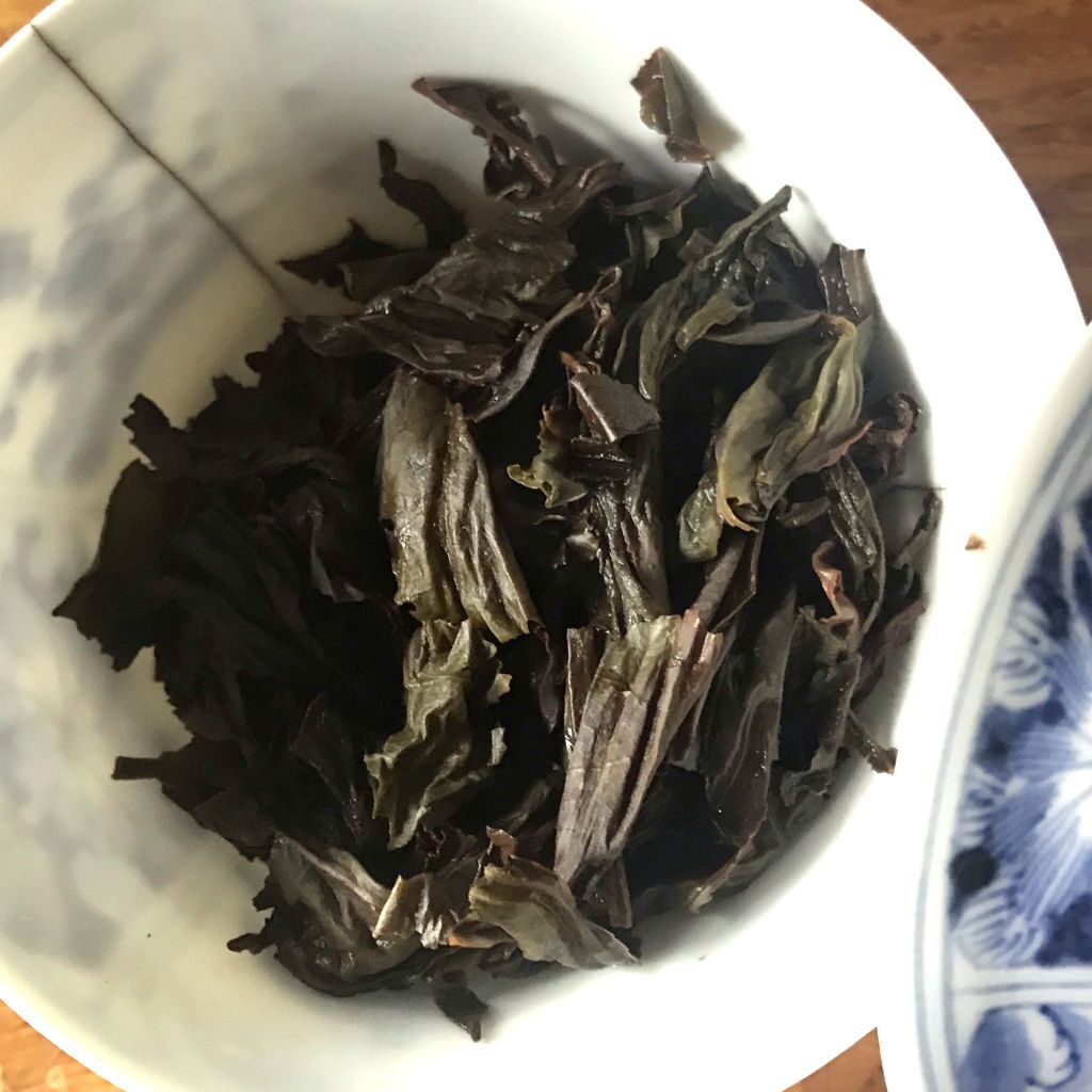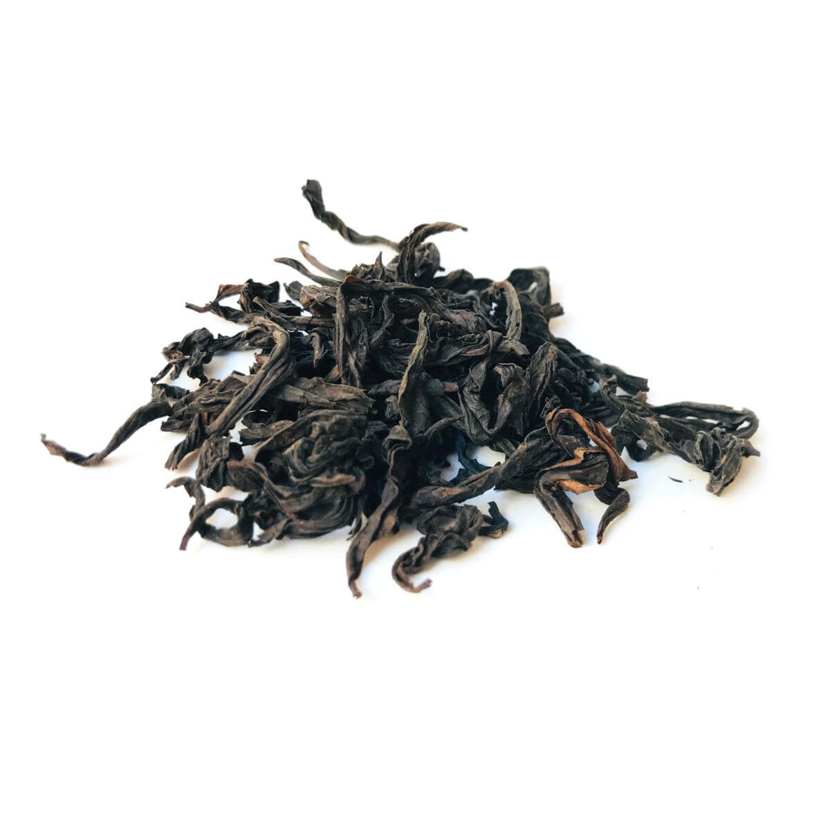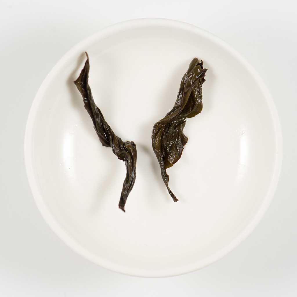 Da hong pao recolectado a mano en la zona sur oeste de la montaña de Wuyi. Té envejecido ligeramente de hoja madura, medio oxidada y con un tueste con carbón, de forma estirada y torneada, de color marrón-negro oscuro.